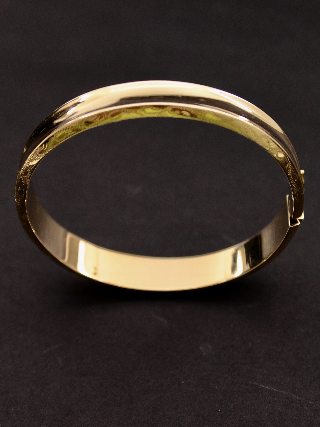 14 carat gold bangle inside 6.2 x 5.5 cm. b. 1.1 cm. weight 21 grams from goldsmith Fl. Lund Copenhagen subject no. 557382