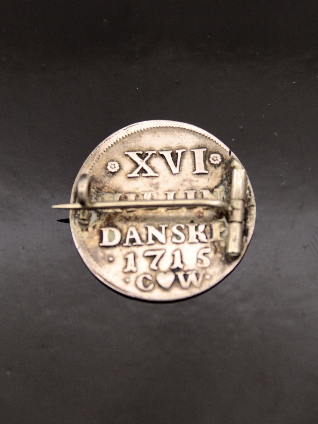 XVI skilling sølv mønt fra 1715 som broche D. 2,6 cm. emne nr. 594265