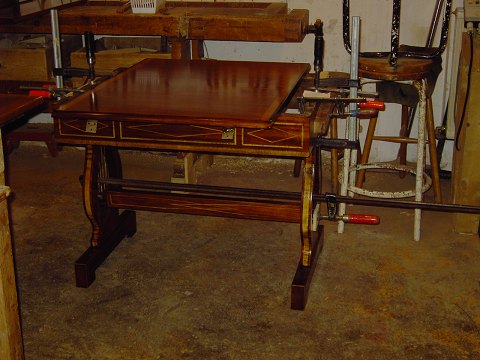U-shaped table from mahogany. Complete restoration. In the photo you can see the brass strings are changed.