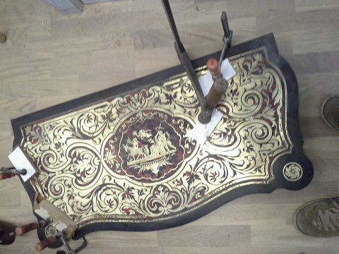 Messing og skildpadde løftet hvor det var gået løst. Renset af og derefter fæstnet på ny. Gammel lim fjernet, og ny oppolering af overfladen så glansen genopstår.