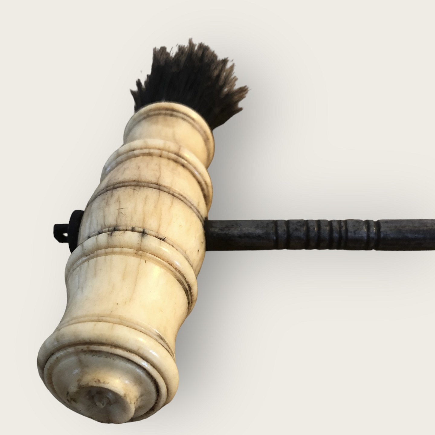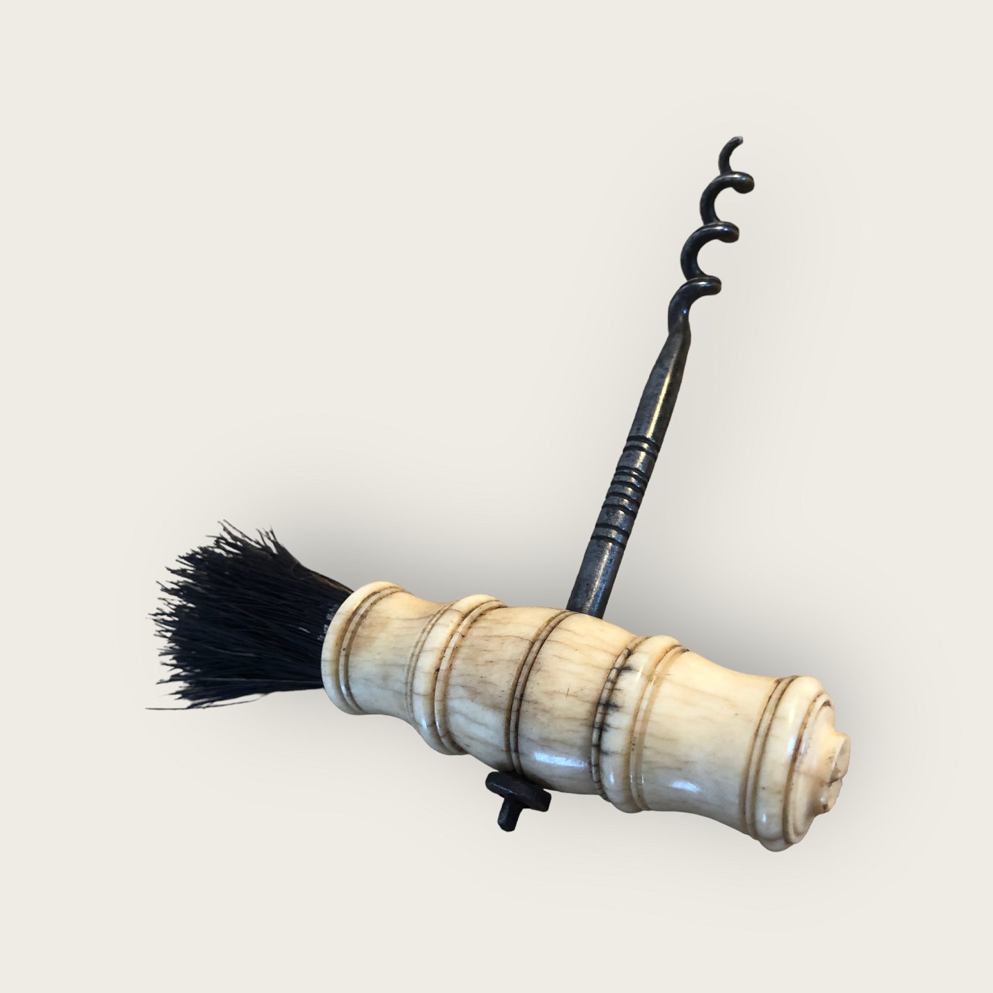 Older English corkscrew with bone handle and horsehair brush. Nice used condition. Dimensions: 12 x 14 cm