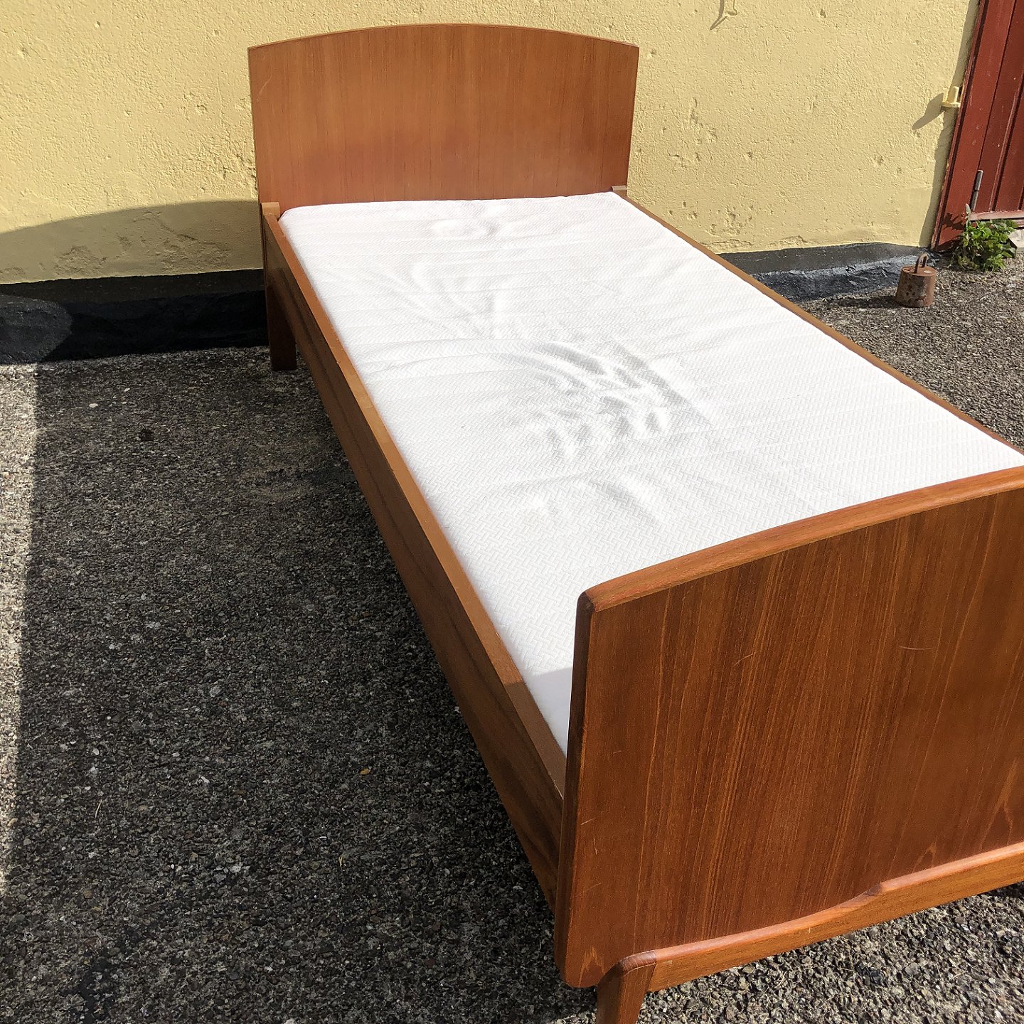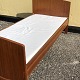 Two beds in teak veneer, with slatted base. Danish modern from the 1960s. Please note that the headboard against the wall is not veneered (see last photo) and the beds are sold without mattresses. Appears in good condition.
