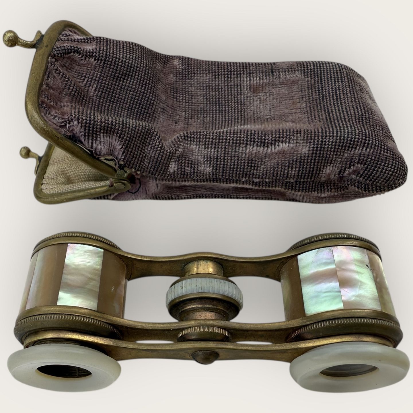 Theater binoculars with mother of pearl and holster, nice patinated condition, 9x3.5 cm.