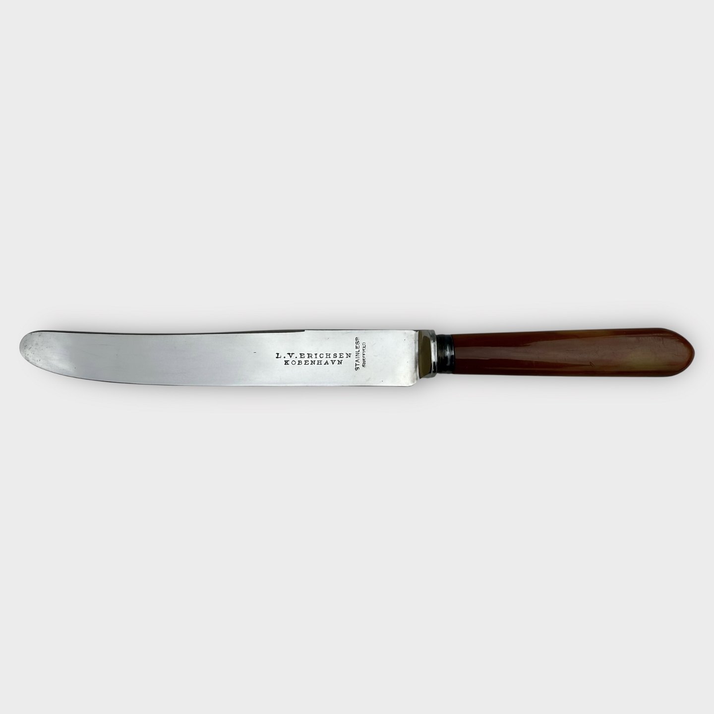 L. V. Erichsen, Copenhagen, knives with brown plastic handles and blades in Stainless Sheffield (stainless steel), length 25cm, good used condition