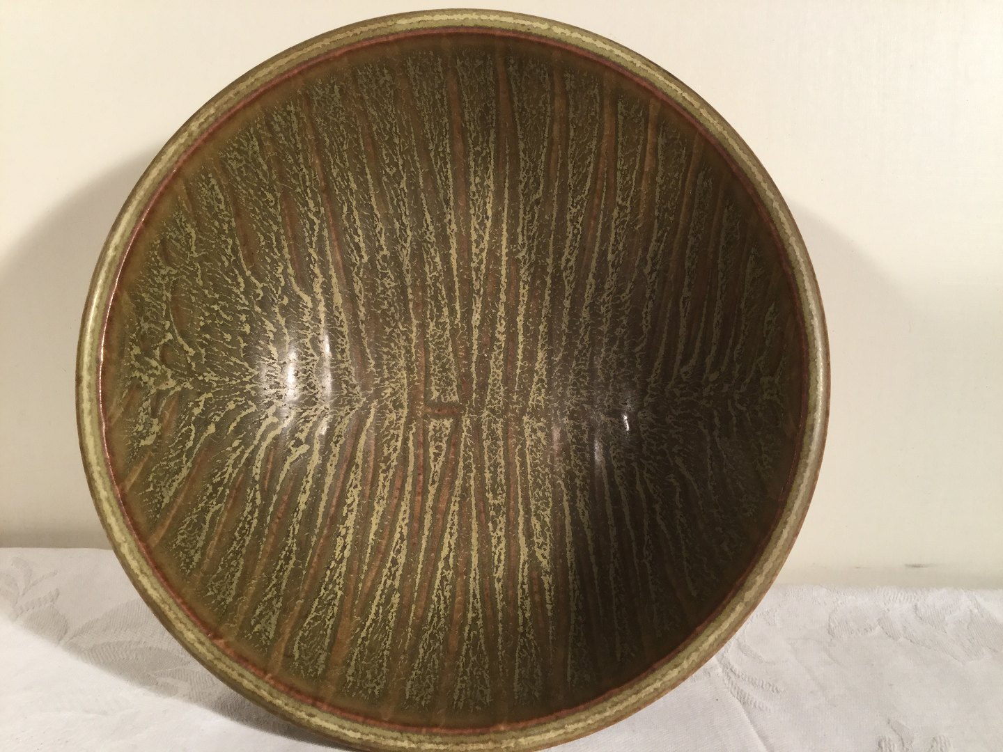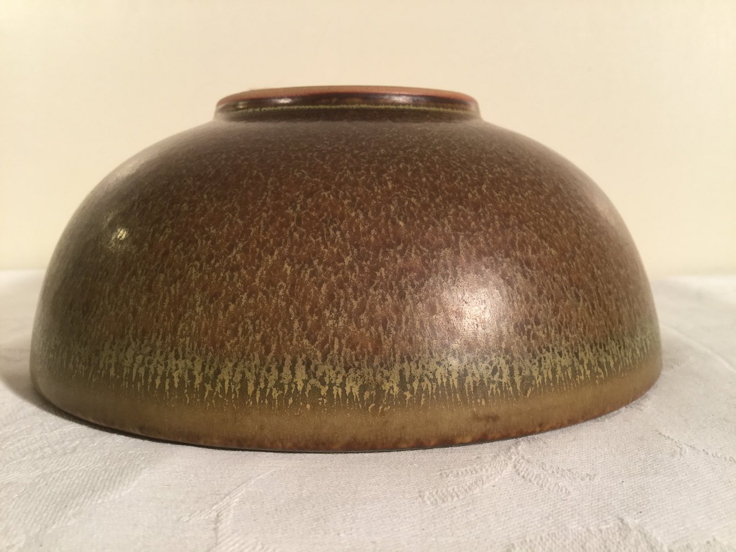 Royal Copenhagen, Unika Skål #8462/9393, 17,5cm i diameter, Design Nils Thorsson *Brun & Grøn nisteret glasur der løber sammen, Perfekt stand*