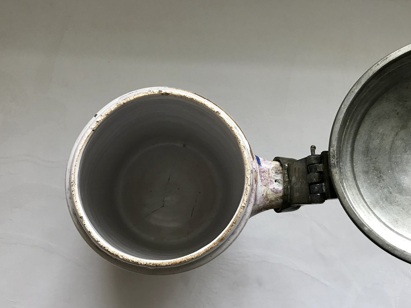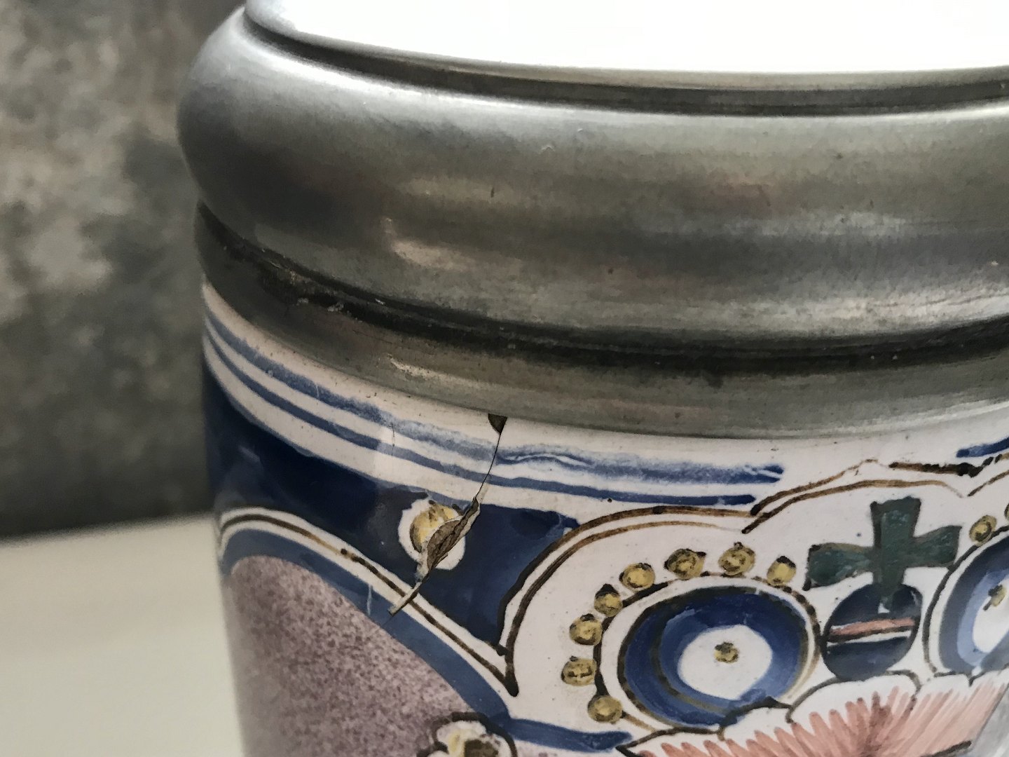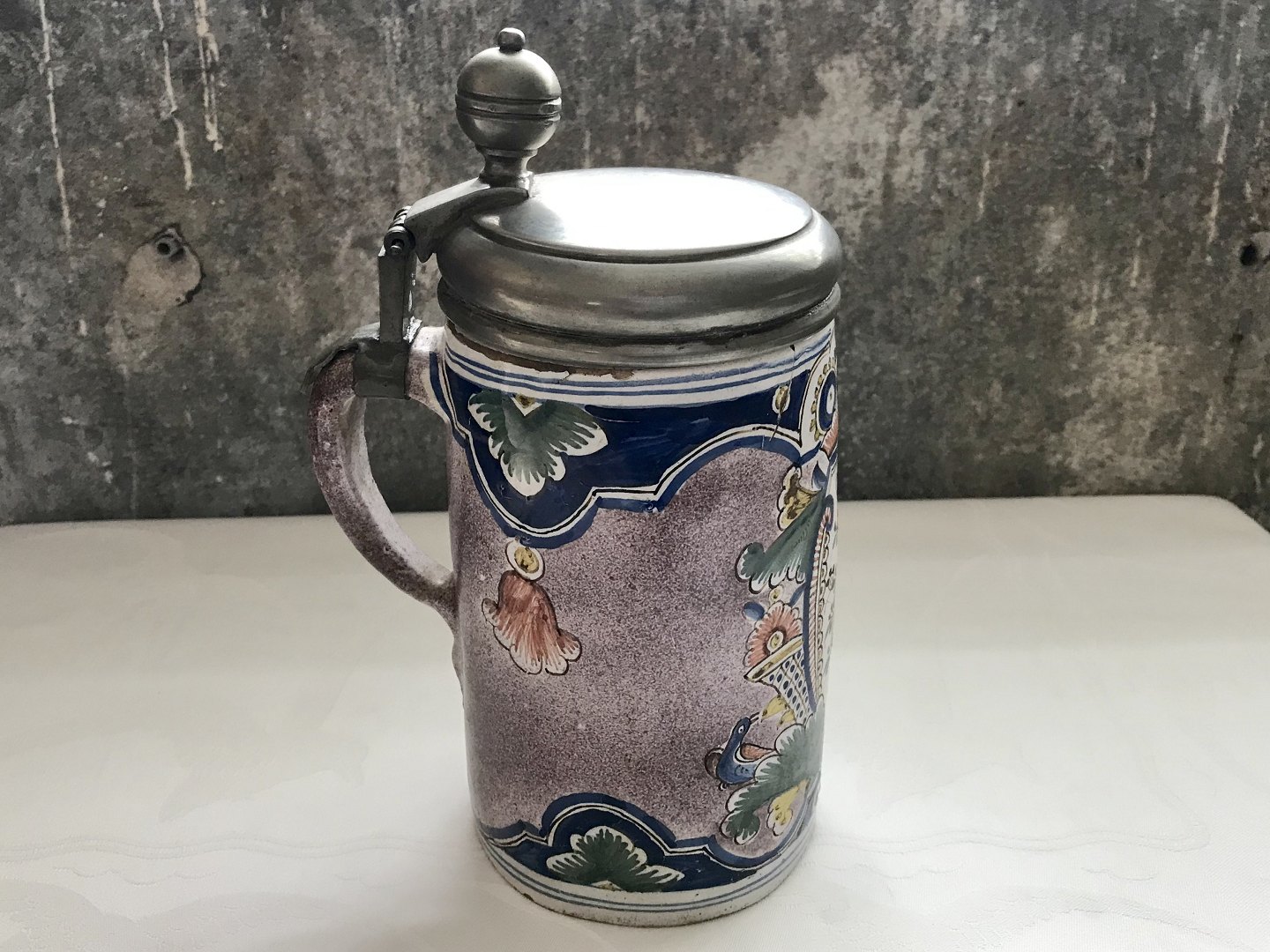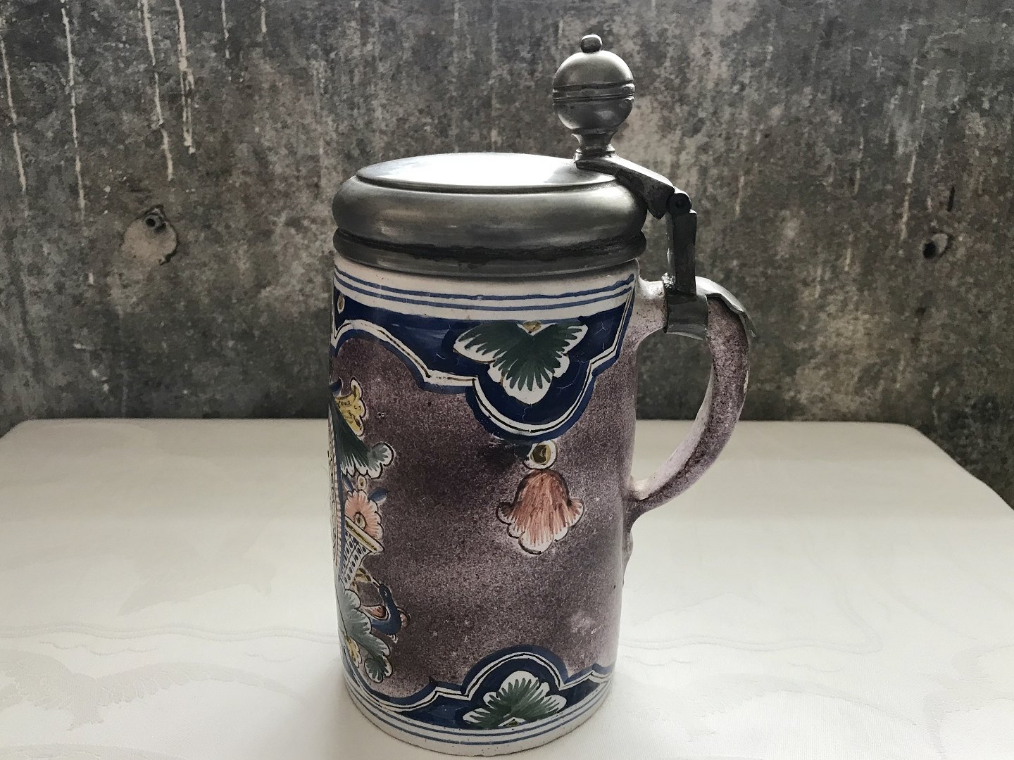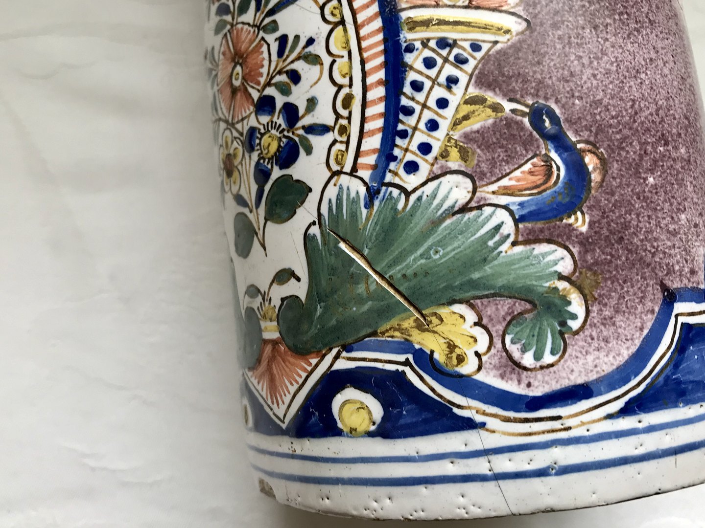 Tysk lågkrus i fajance med blomstermotiv 1700-1800 tallet, 25cm høj, 9,4cm i diameter *Fremstår med revner*