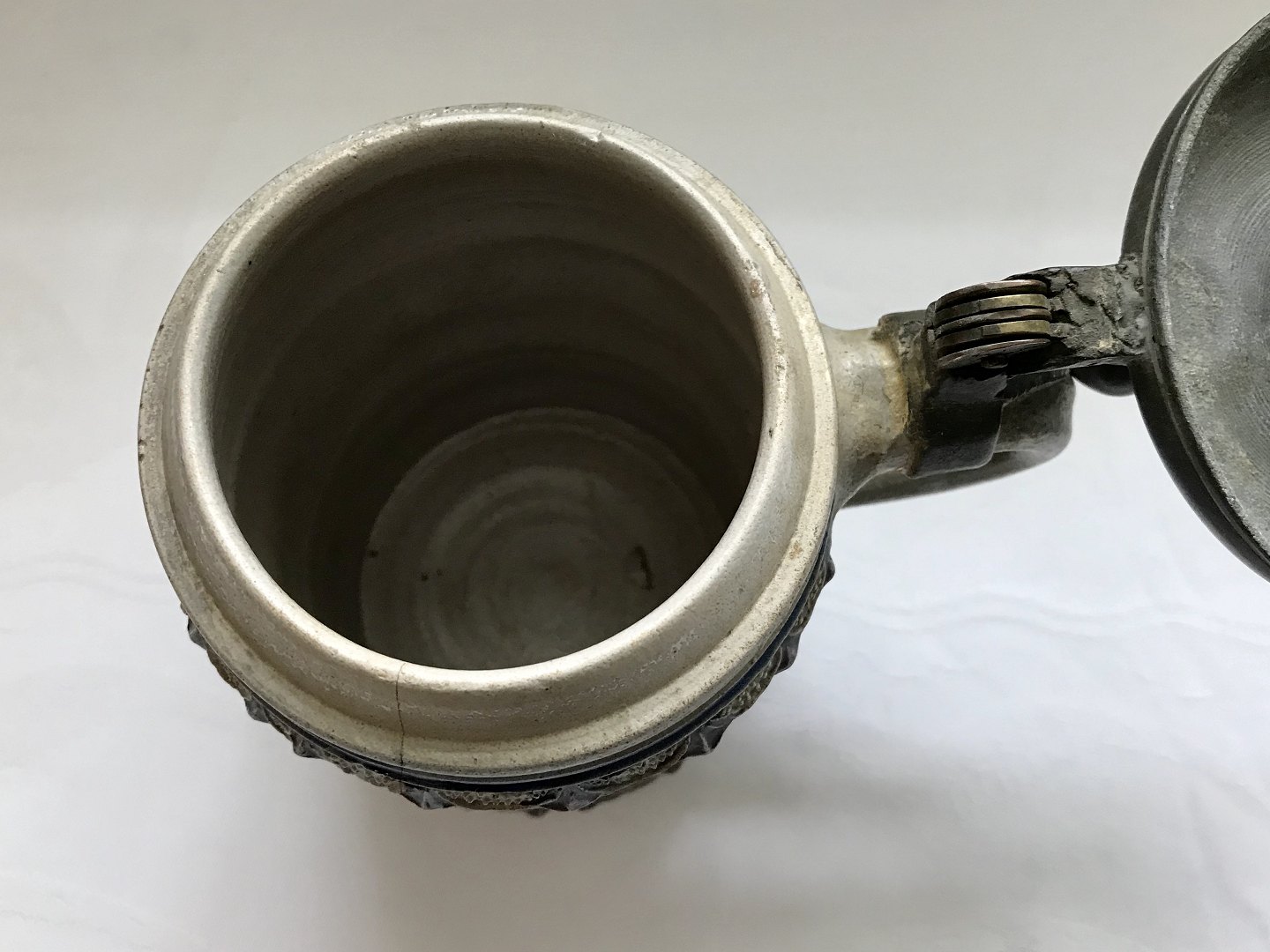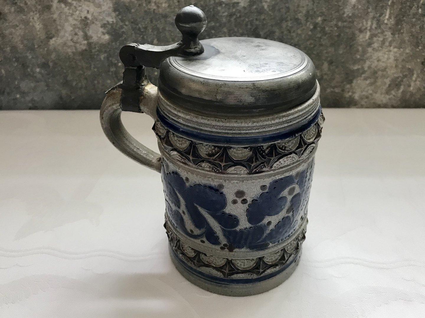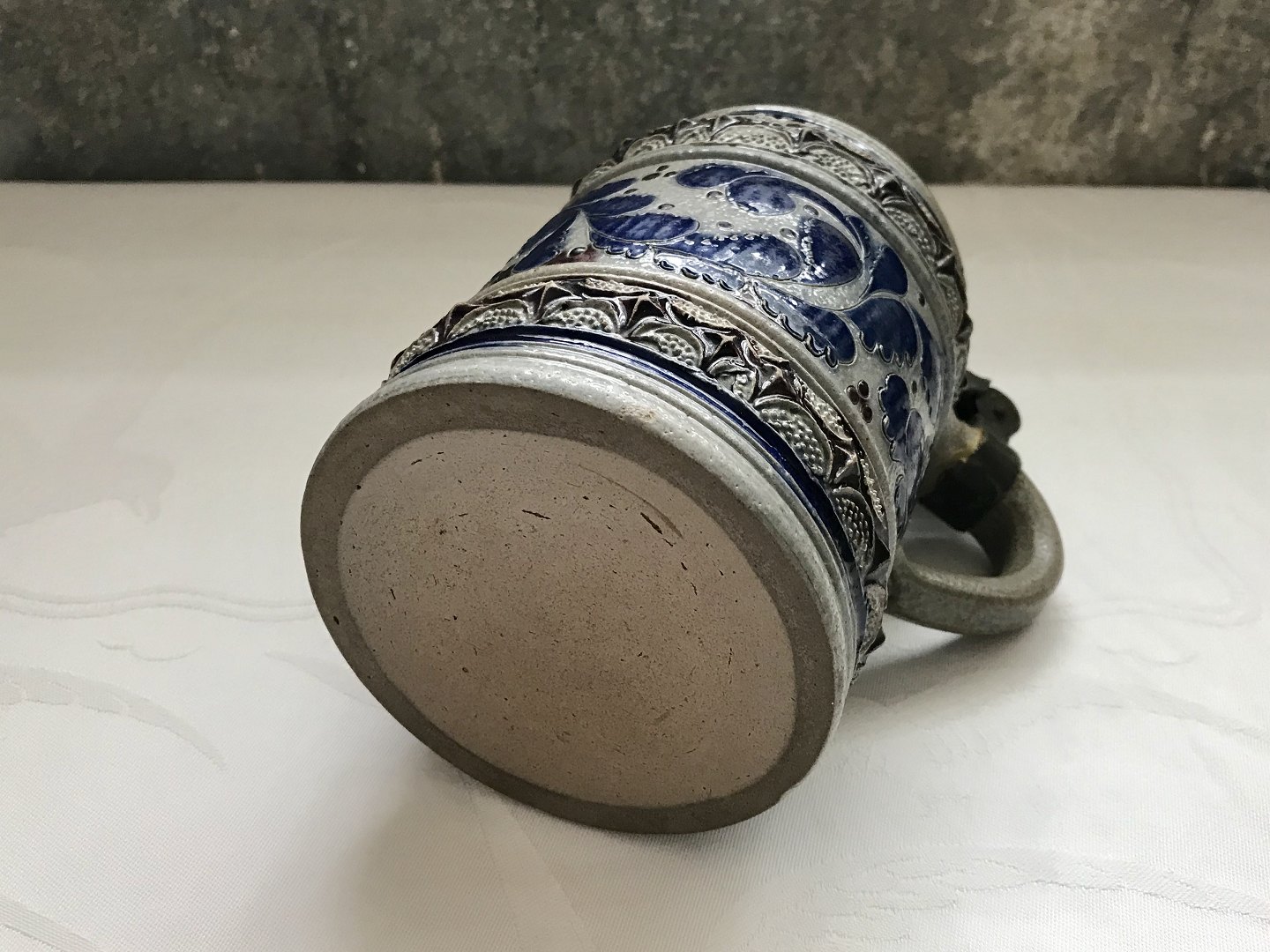Tysk ølkrus af saltglaseret stentøj , 18cm høj, 8cm i diameter, *Med hårrevne*