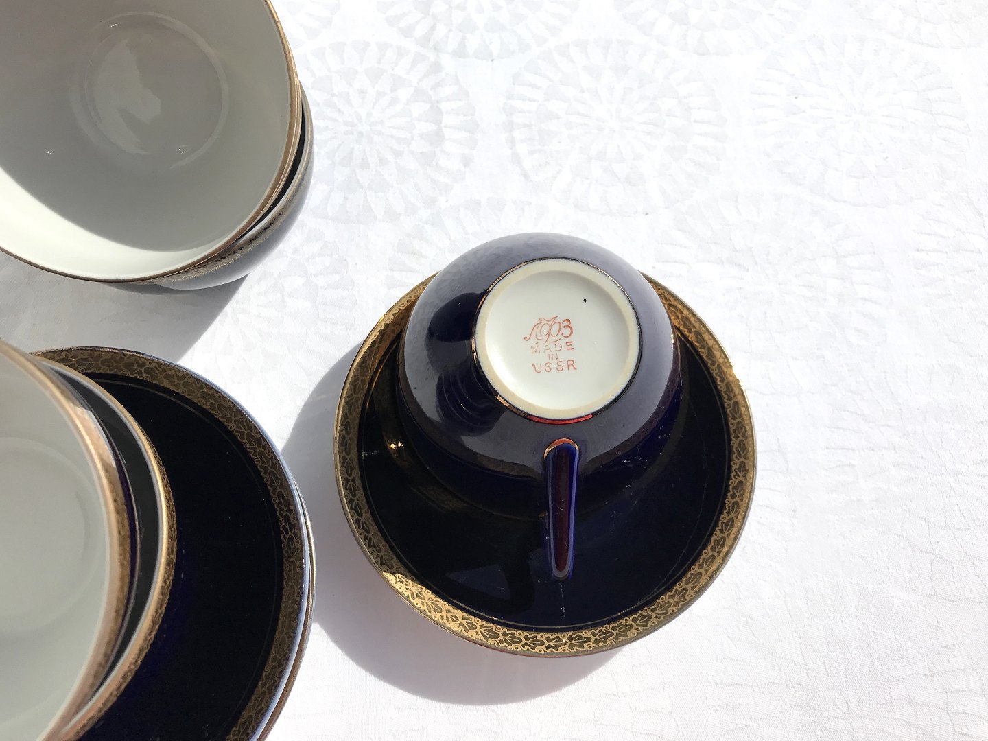 Russisk Testel, Mørk blå med guldkant, 9,5cm i diameter, 6cm høj, 6 sæt sælges samlet *Pæn stand*