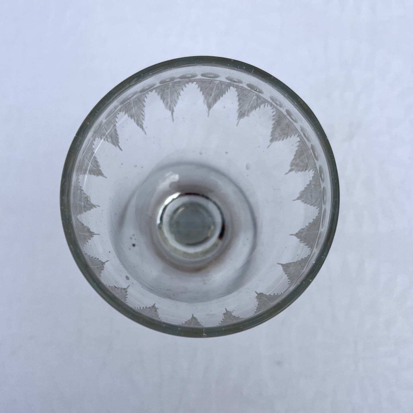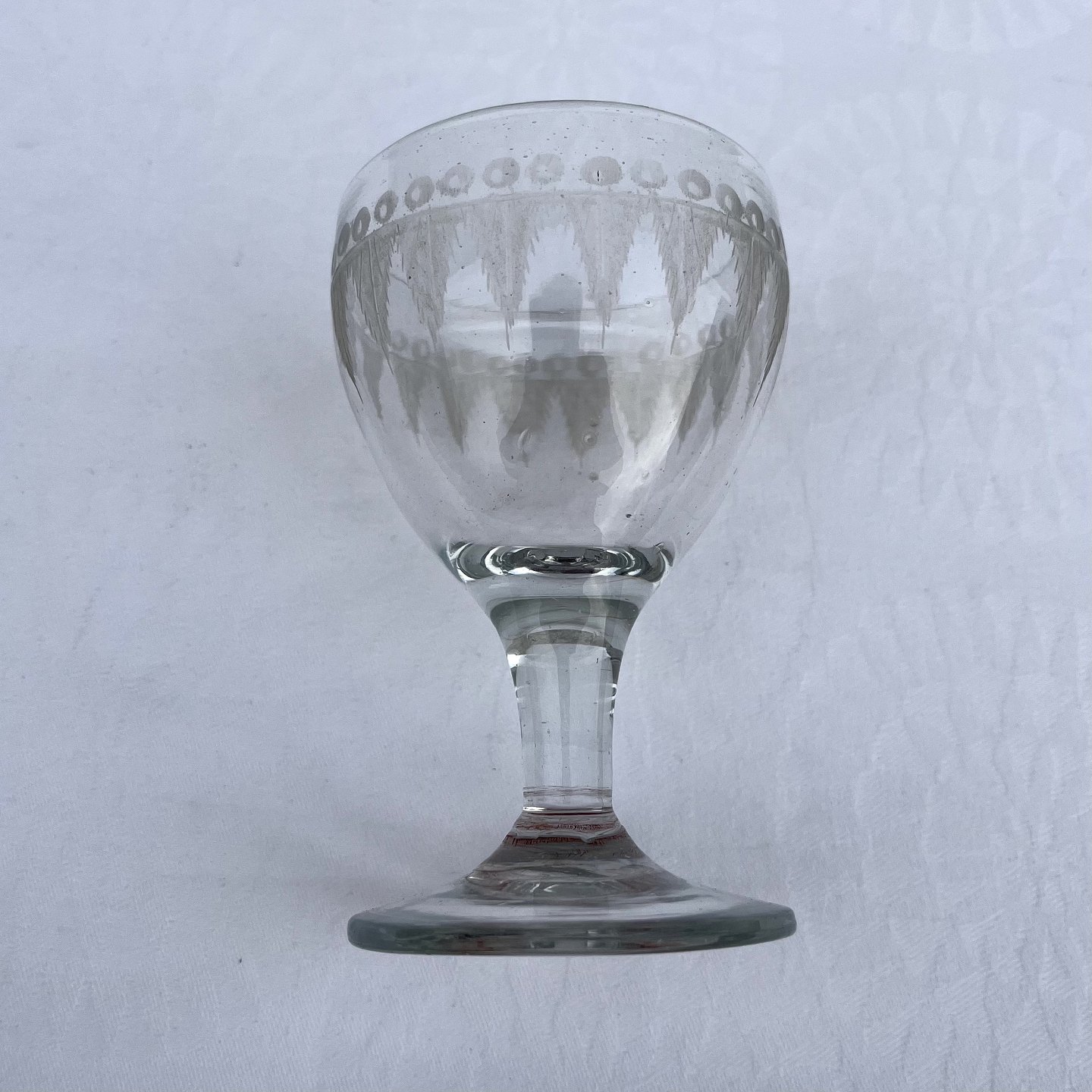 Ældre vinglas med en matslibning i lambrequin-mønster (Spidsblad mønster) Mange loftbobler/ujævnheder i glasmassen, 10,5cm høj, 7cm i diameter, Antagelig Svensk eller Norsk *Pæn stand*