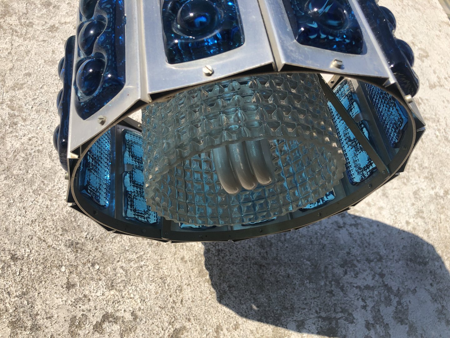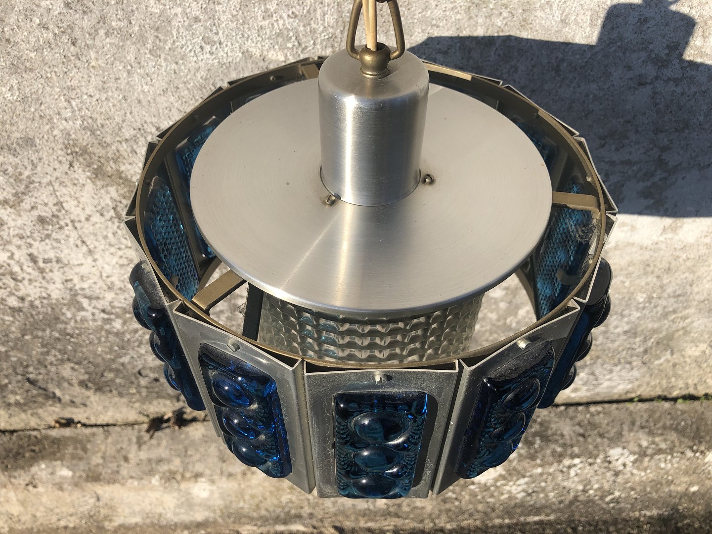 Lampe fra 1960'erne i aluminium og med blå glas. Diameter ca 26 cm *Fremstår med en lille ubetydelig sprække i det indre glas - ellers pæn stand*