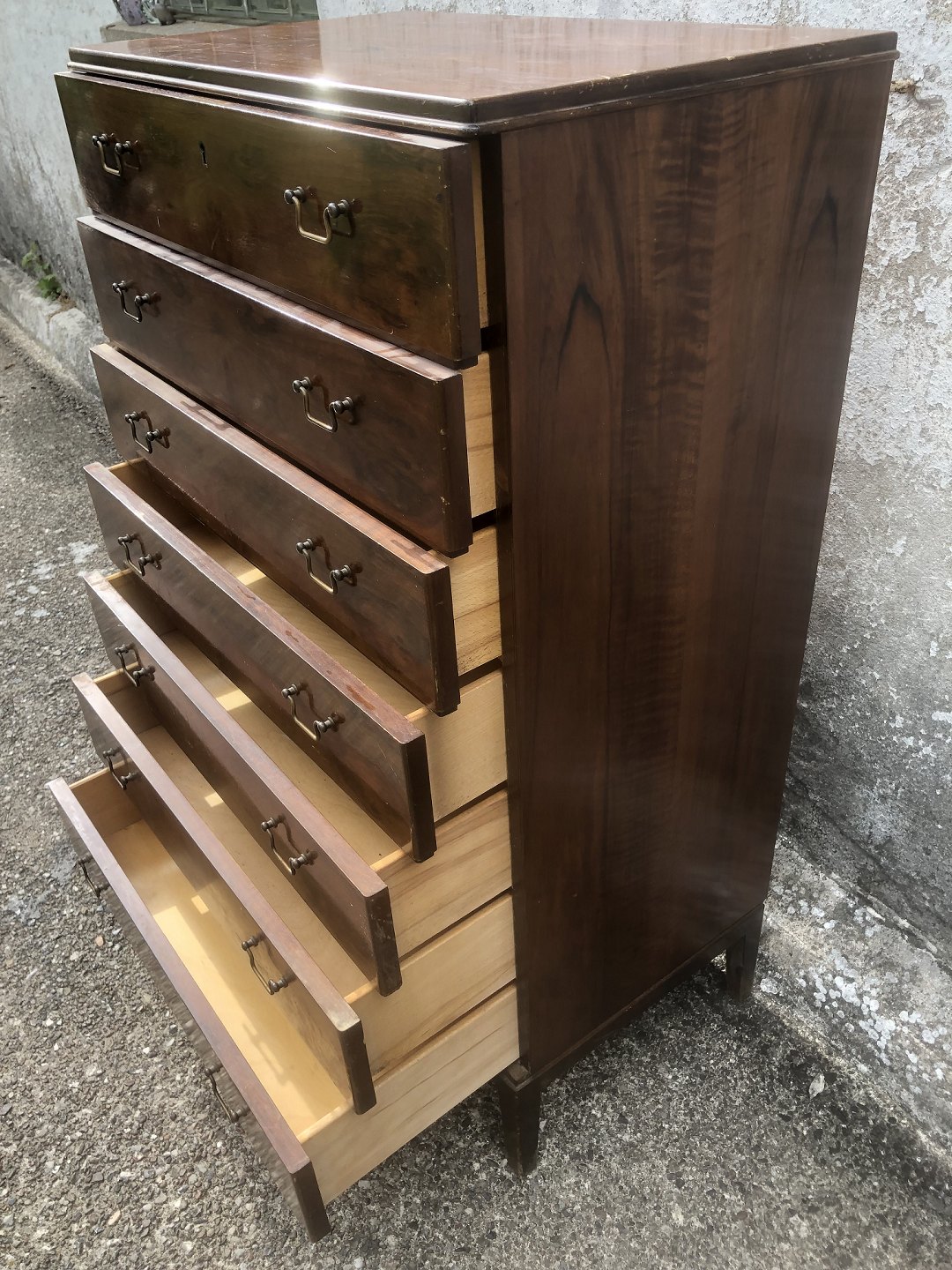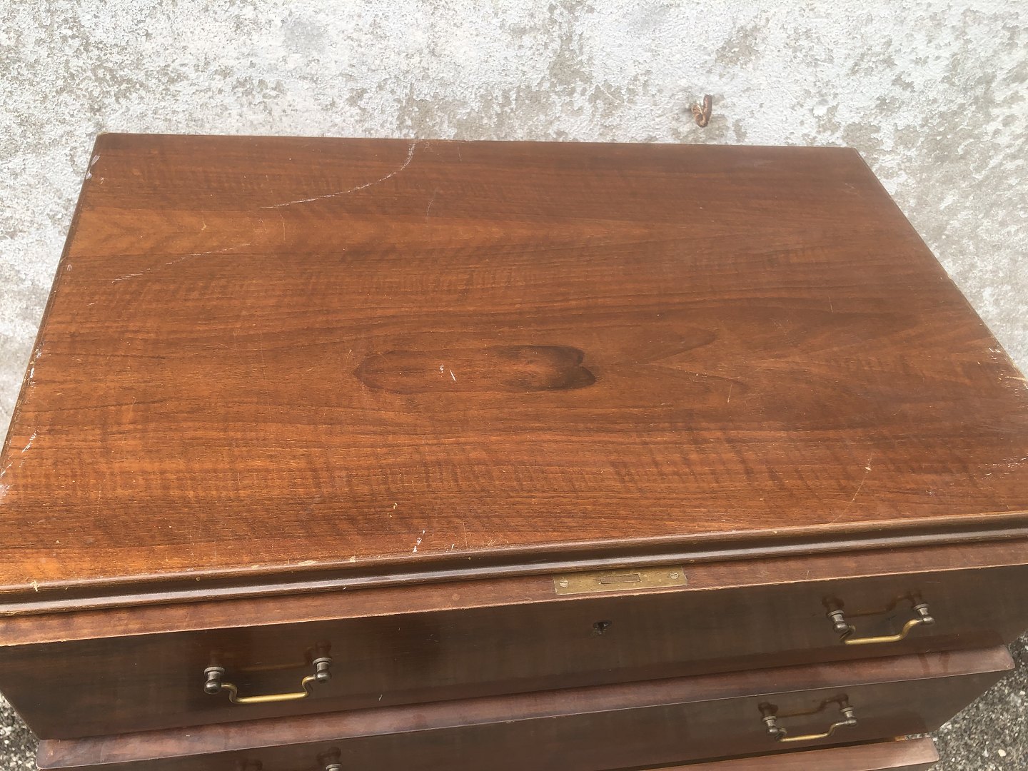 Kommode i lakeret nøddetræsfiner. Fremstår med aldersrelaterede brugsspor. Mål: 118x70x43 cm