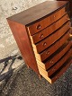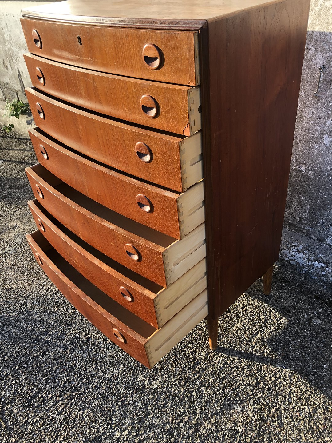 Kommode i teakfiner fra 1960'erne med buet front. Fremstår med fine håndtag men med nogle finerafslag / skrammer. (se foto) Danish modern. 113x80x44 cm