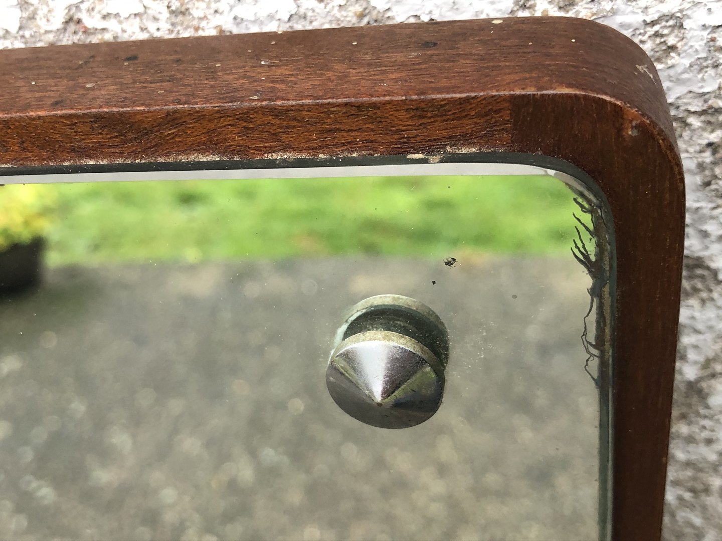 Spejl med mørk træramme. Enkelte pletter i spejlglasset langs kanten ellers pæn brugt stand. Mål: 106x49 cm