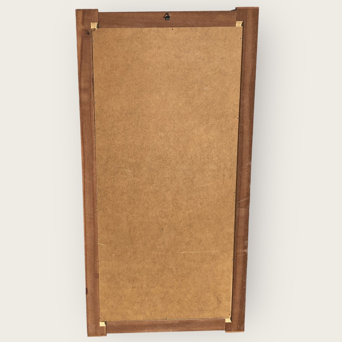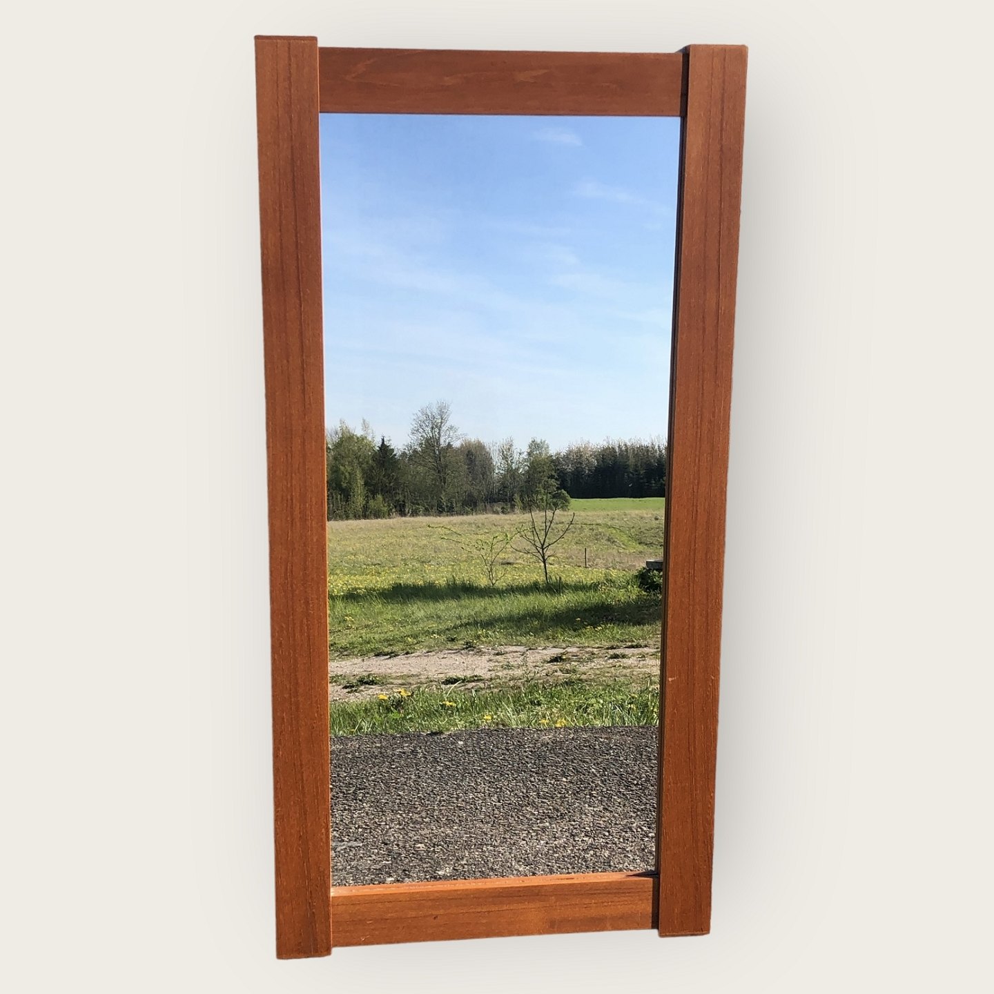 Stort spejl i bred ramme af teaktræsfiner. Danmark fra 1970'erne. Mål: 122x61 cm. Pæn stand