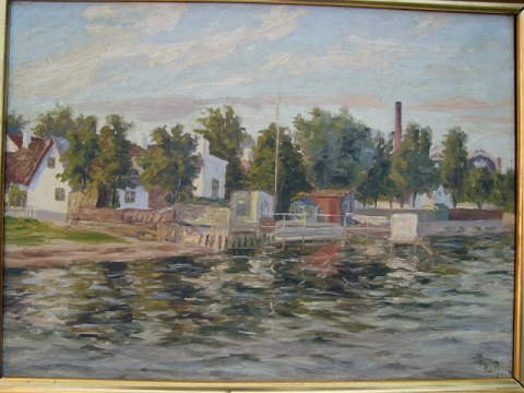 Ubekendt kunstner (20 årh): Kystparti med huse og både i havn - Nordsjælland?? Olie på lærred. Sign.: AL.P. (??)(se foto) Dateret - 19?? 32x44 (46x57)