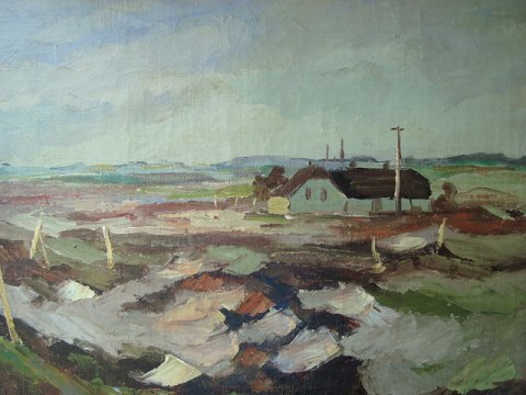 Børge Ibsen (1913-2002): Klitlandskab med hus. Olie på lærred - nyrenset. Sign.: B. Ibsen 47x63 (54x71)