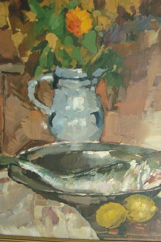 Nature Morte med torsk, blomster i vase og citroner på bord.