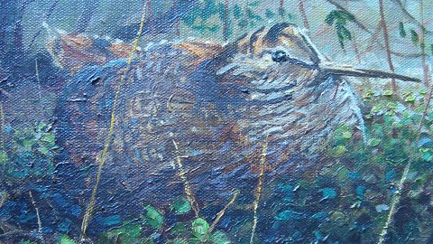 Ubekendt kunstner (20 årh): Skovsneppe på rede. Olie på lærred. Usigneret. 24x30 (31x37) Et meget spændende maleri - rigt detaljeret med græs, grene, blade og ikke mindst fuglen - en skov sneppe.