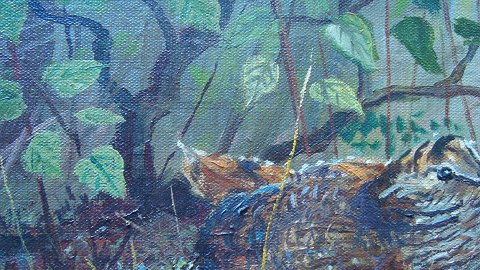 Et meget spændende maleri - rigt detaljeret med græs, grene, blade og ikke mindst fuglen - en skov sneppe.