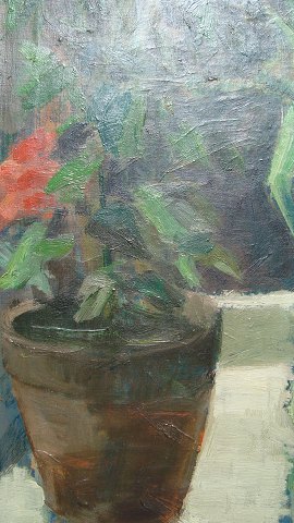 Opstilling med blomster og ymerskål i vindue 1948.