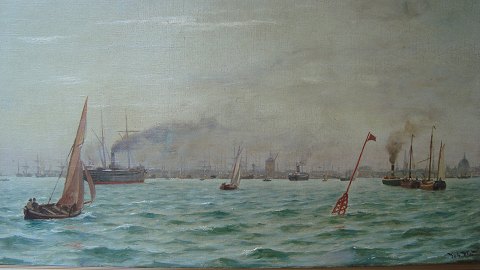 Indsejlingen til København med mange skibe, Holmen, Amalienborg Slot og Frederiks Kirke (Marmorkirken) i baggrunden.