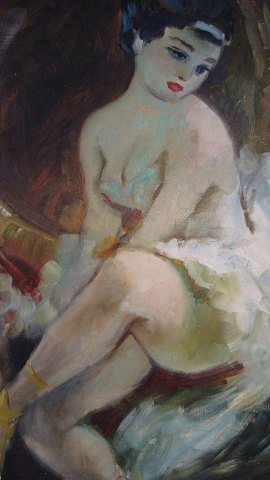 Knud Haugart (1911-93): Ballerina siddende ved ovalt guldspejl 1959. Olie på lærred. Sign.: Hougart 59. Enkelte "strit" af guldbronce fra maling af ramme. 77x62 (91x79)