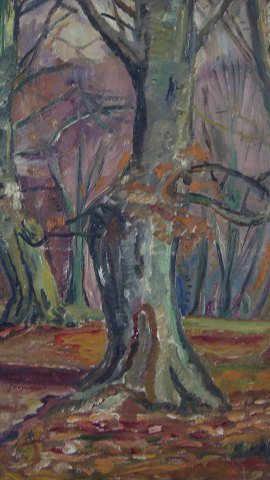 Ubekendt kunstner (20 årh): Hus i skov, efterår. Olie på lærred. Sign.: Solveig ?? 46x60 (52x66)