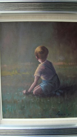 Ubekendt kunstner (20 årh): Dreng plukker blomster i landskab. Olie på lærred. Sign.: Jenny 42x33 (57x49)