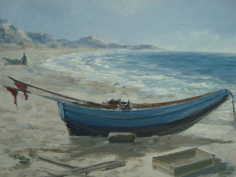 Evelyn Thorbjørn (1911-90): Strandparti med optrukne fiskerbåde. Olie på lærred. Sign.: E. Thorbjørn Bagpå lærred: 175-78 35x50 (46x51)
