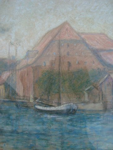 Ubekendt kunstner (20 årh): Havneparti fra København? pastel på papir. Usigneret. Indrammet i meget smuk, gammel og tung guldramme. 35x46 (49x60)
