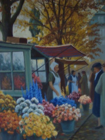 Chr. Jensen Virklund (født 1896): Blomstersælgerne ved Christiansborg Slotskirke, København. Olie på lærred. Sign.: CJV 96x79 (108x91)