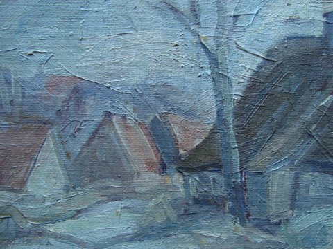 Vinterlandskab med huse.