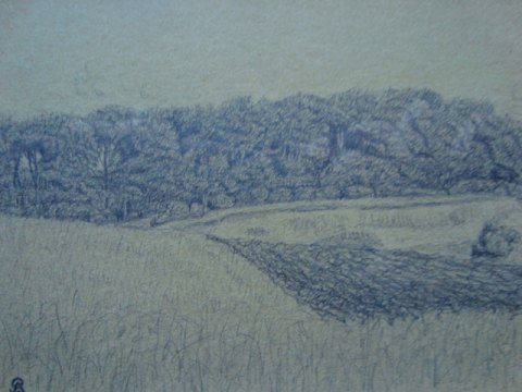 Arne Rolstad (1869-1944): Landskab ved Allerød Teglværks Lergrav 1917. Bly på papir. Sign.: AR (monogram) Titel - Ved Allerød Teglværks Lergrav 26/7 17. 12x23 (22x32)