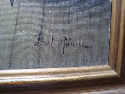 Frederik Drews (1909-60): Interiør fra bondestue. Olie på lærred. Sign.: Poul Rønne 40x48 (47x57) Frederik Drews brugte mange forskellige pseudonymer - bl.a. Poul Rönne når han malede interiører.