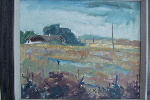 Knud Bøstrup (1927-2011): Klitparti med grantræer og gård i baggrunden. Olie på lærred. Sign.: K. Bøstrup 25x30 (34x39)