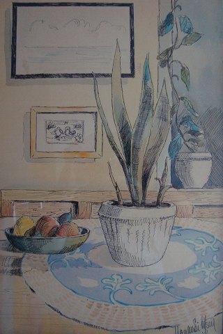 Ubekendt kunstner (20 årh): Opstilling på bord ved vindue med frugter og "Svigermors skarpe tunge" 1946. Akvarel på papir. Sign.: Mogens Ei.....sen. - 46. 56x42 (58x45)