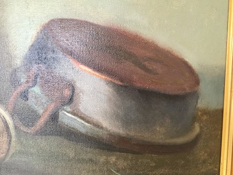 Witold Wisniewski (1921-77): Opstilling med kobbertøj på bord. Olie på lærred. Sign.: W. Wisniewski. Bagpå navn - Witold Wisniewski og Warszawa samt diverse stempler. 50x61 (61x72)