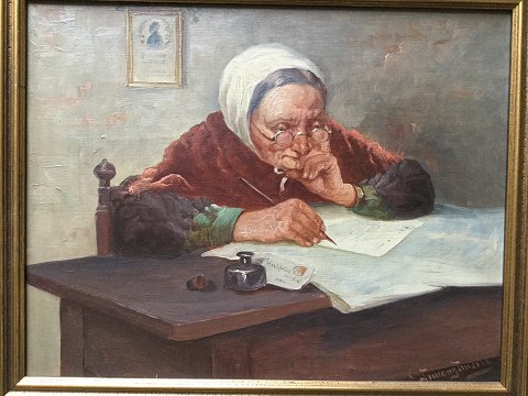 Gammel kone skriver brev i stuen..