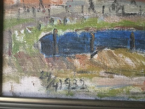 Ubekendt kunstner (20 årh): Byparti med stor rødstens kirke ved vandet 1932. Olie på plade. Usigneret. Dateret - 24/4 1932. Indrammet i smuk sølvramme. 34x45 (42x53)