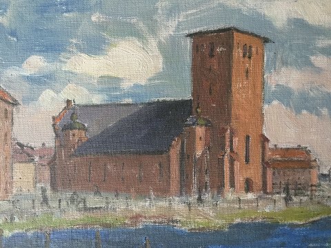 Ubekendt kunstner (20 årh): Byparti med stor rødstens kirke ved vandet 1932. Olie på plade. Usigneret. Dateret - 24/4 1932. Indrammet i smuk sølvramme. 34x45 (42x53)