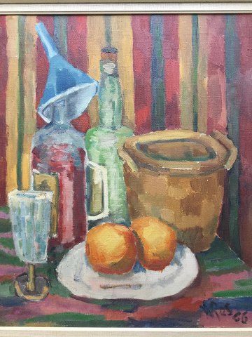William Rasmussen (1907-82): Opstilling på bord med flasker, frugt mv. 1966. Olie op lærred. Sign. WRas. - 66. 55x46 (61x52)