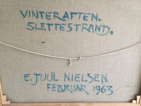 E. Juul Nielsen (20 årh): Kystparti fra Slettestrand 1963. Olie på lærred. Sign.: E. Juul Nielsen 63. Bagpå betegnet - Vinteraften Slettestrand Februar 1963. 60x79 (68x86) 12918