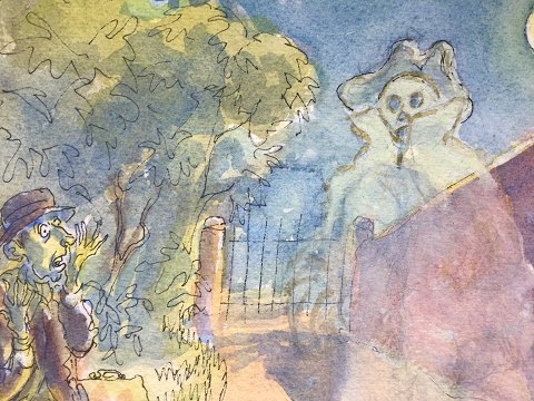 Illustration med Spøgelse og mand på bænk 1977.