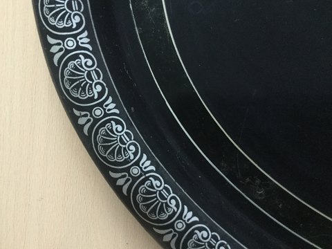 Antik, oval lakeret metal bakke. Sortlakeret dekoreret med kineserier i hvidt og perlemor. Smuk sølv frise rundt kanten. Antagelig England 19. årh. 50x61