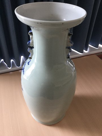 Kinesisk Porcelæn (19 årh): Svag celadon fond med blå og hvid dekoration. Dekoreret med påfugl og fuhund. 2 gennembrudte ører. Uden stempel. Højde - 44½ cm. Diameter i top og bund - ca. 18 cm.