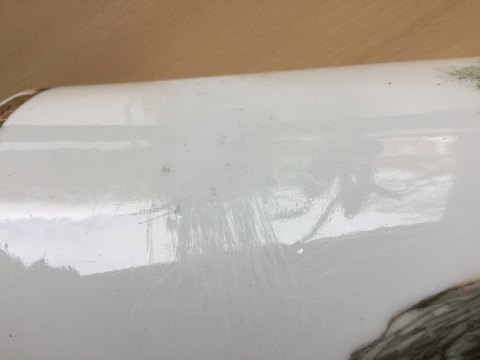 Skriftstegn forsøgt fjernet, derefter ridser (se ekstra foto)