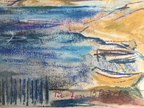 Børge Bokkenheuser (1910-76): Bjerglandskab ved sø 1969. Oliekridt på papir. Sign.: B.B. 69. Betegnet - Til Jonna Indrammet i mahogni ramme. 29x42 (40x52)