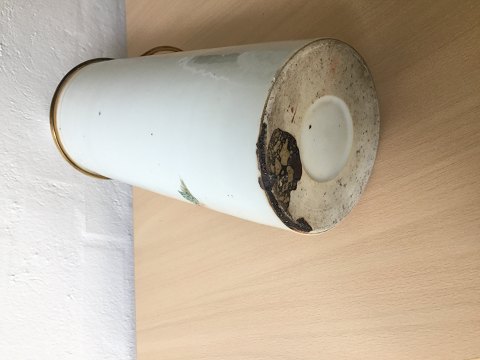 Polykrom dekoreret med skrifts tegn og scene med personer.
