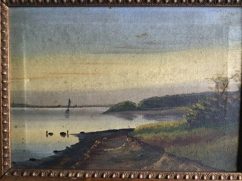 Carl Wetlesen (1847-79): Kystparti med sejlskib. Olie på lærred Lidt snavset. Sign.: CW 20x28 (25x33)