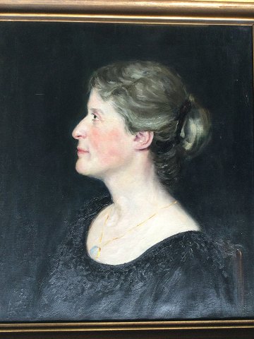 Profil portræt af ung kvinde i sort udringet kjole med rouge og guldmedaljon.